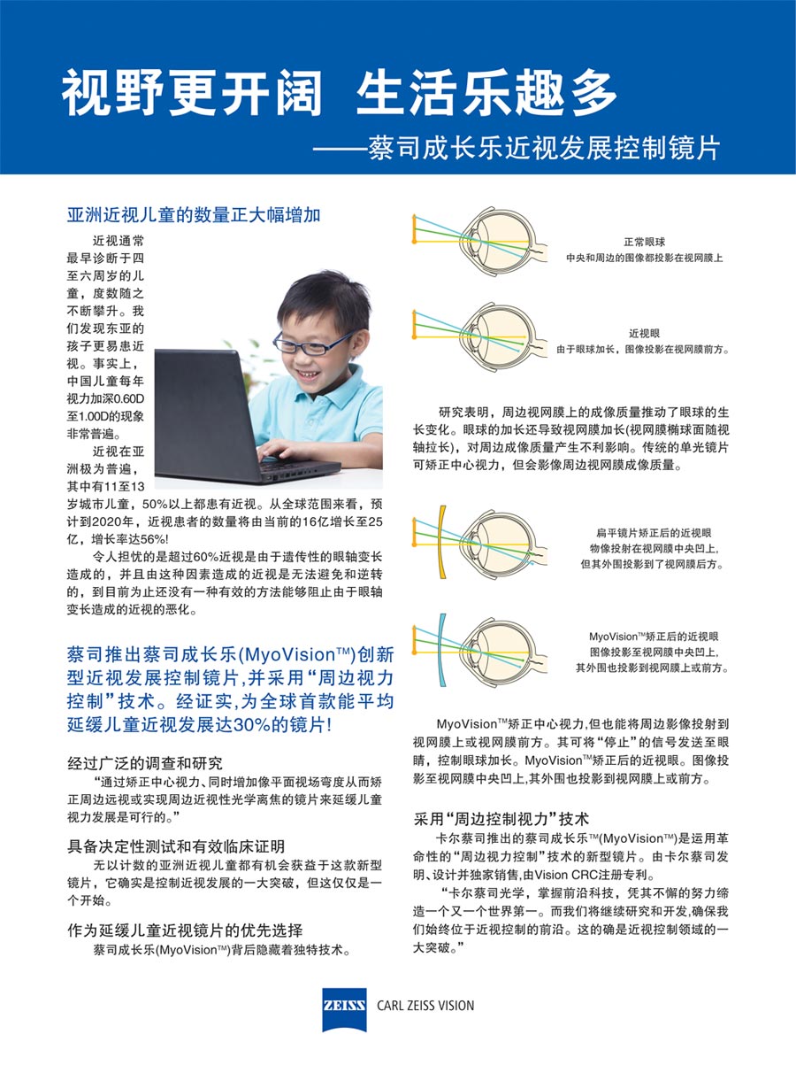 2010年8月24日,全球光学技术领先企业之一——德国卡尔蔡司光学公司(Carl Zeiss Vision)在北京正式向中国消费者推出全新革命性光学镜片“蔡司成长乐”(MyoVisionTM)。